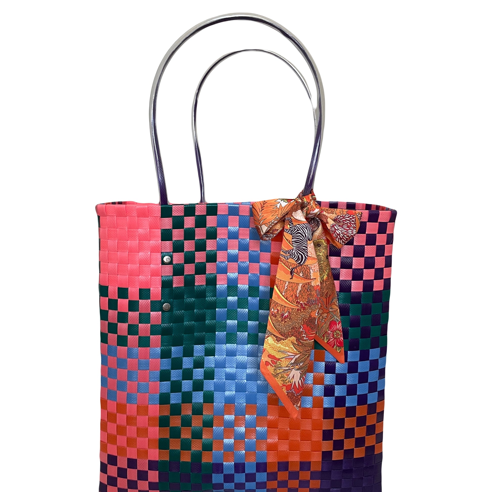 Handmade in recycled plastic material. Lightweight but very resistant, easy to clean, water resistant. This product is one of a kind. You may find similar patterns. Perfect for beach or pool stuff, groceries, gym stuff or books.
